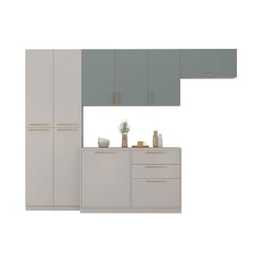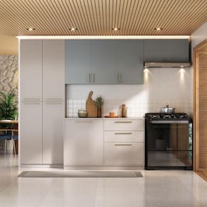 Os rodapés em PVC com altura de 7,5 cm proporcionam um acabamento perfeito, enquanto as dobradiças de 35mm com tecnologia slow motion garantem conforto, resistência e suavidade ao abrir e fechar as portas. As corrediças telescópicas de 3 estágios com mais de 30 de aço oferecem e abertura total das gavetas.