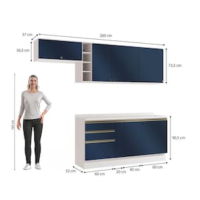Transforme sua cozinha com toda a beleza e praticidade do Conjunto CB1411 da Cozinha Celeste Kappesberg. Produzido 100% em MDF de 15mm, o que garante mais robustez, firmeza e qualidade, além de um acabamento perfeito. São 2,30m de altura, 2,60m de largura e 52cm de profundidade nos balcões e 37cm nos aéreos. A caixaria é em pintura na cor branca e acabamento brilho, enquanto as frentes são na cor azul profundo, com acabamento fosco.