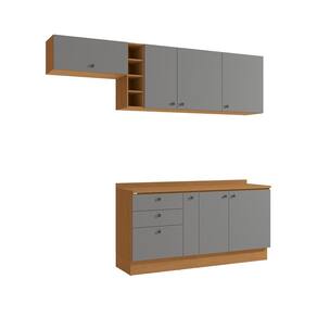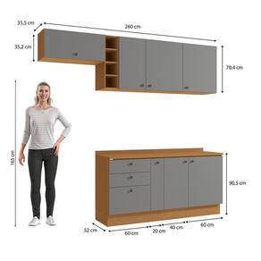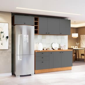 Já as frentes, na cor cinza sagrado, contam com acabamento fosco em BP, proporcionando maior durablidade contra riscos, arranhões e gotas d'água. Uma combinação elegante e moderna, que dará ainda mais destaque ao seu espaço, deixando sua cozinha perfeita. Versátil e funcional, são 2,20m de altura, 2,60m de largura e 52cm de profundidade, perfeito para o estilo minimalista, o combo une quatro balcões, com gaveteiro e balcão de 60cm, porta-temperos e balcão de 40cm, além de cinco aéreos, sendo dois de 60cm, um de 40cm, nicho garrafeiro e aéreo basculante, uma composição versátil e indispensável para quem procura por funcionalidade.
