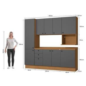 Já as frentes, na cor cinza sagrado, contam com acabamento fosco em BP, proporcionando maior durablidade contra riscos, arranhões e gotas d'água. Uma combinação elegante e moderna, que dará ainda mais destaque ao seu espaço, deixando sua cozinha perfeita. Completo e muito funcional, são 2,20m de altura, 2,30m de largura e 52cm de profundidade, perfeito para todos os espaços, o combo une dois balcões, um de 60cm e o balcão de pia, além dos aéreos nas mesmas medidas, incluindo ainda o nicho para microondas e o paneleiro, uma composição completa e muito versátil, indispensável para quem procura por funcionalidade.