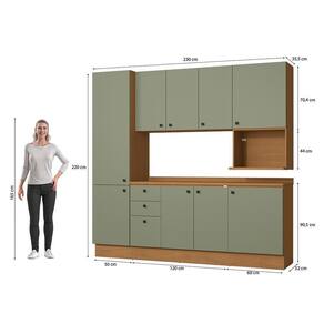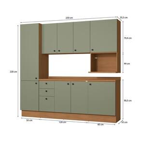 Já as frentes, na cor verde frevo, contam com acabamento fosco em BP, proporcionando maior durablidade contra riscos, arranhões e gotas d'água. Uma combinação aconchegante e moderna, remetendo aos tons da natureza e deixando seu ambiente lindo, incluindo facilidade durante a limpeza. Completo e muito funcional, são 2,20m de altura, 2,30m de largura e 52cm de profundidade, perfeito para todos os espaços, o combo une dois balcões, um de 60cm e o balcão de pia, além dos aéreos nas mesmas medidas, incluindo ainda o nicho para microondas e o paneleiro, uma composição completa e muito versátil, indispensável para quem procura por funcionalidade.