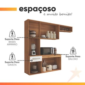 O Armário de Cozinha Completa Suspenso Belíssima traz qualidade, elegância e praticidade para o seu dia a dia. Contém 6 portas com prateleiras bem divididas para melhor aproveitamento do espaço, armário aéreo com nicho organizador, puxadores modernos e balcão com tampo que se torna uma excelente bancada para acomodar seus utensílios de cozinha. Com muita funcionalidade, vai deixar seu lar ainda mais bonito. MEDIDAS: [ A ] = 135 cm [ L ] = 165 cm [ P ] = 35 cm MODELO: Armário de Cozinha Completa Suspenso Belíssima MARCA:Fiorello COR: Freijó/Branco ACABAMENTO: Pintura UV MATERIAL DA ESTRUTURA: MDP ESPESSURA DO MATERIAL: 12mm PORTAS: 6 TIPO DE PORTA: Bater DOBRADIÇAS: Metálicas GAVETAS: 1 GAVETA SUPORTA ATÉ: 2kg CORREDIÇAS: Metálicas MATERIAL DOS PUXADORES: ABS NICHOS: 2 PESO: 35kg GARANTIA: 3 Meses INSTRUÇÕES E CUIDADOS: Utilizar pano macio e seco, não utilizar produtos abrasivos. A Esplanada Móveis se responsabiliza pela entrega dos produtos adquiridos até a porta de entrada ou portaria do endereço indicado, se a portaria do condomínio permitir, as entregas são efetuadas no piso térreo e é de responsabilidade do cliente a locomoção da mercadoria até seu apartamento ou casa. Confira as dimensões do produto e certifique-se de que estão adequadas aos elevadores, portas e corredores do local da entrega. Não fazemos a montagem, desmontagem do produto e/ou portas e janelas, transporte pela escada ou içamento pelo lado de fora do prédio. Não está incluso no serviço de entrega o deslocamento até o interior do apartamento, com ou sem elevador, ou deslocamento em locais de difícil acesso como escadarias. Caso o cliente necessite de entrega dentro das dificuldades mencionadas, deverá entrar em contato para análise e cotação do valor do serviço. Certifique-se de tudo antes de finalizar a compra, evitando assim futuros desagrados ou imprevistos com a entrega.