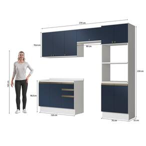 Acabamento: Pintura Brilho / Pintura Fosco | Cor: Branco/Azul Profundo | Corrediças: Telescópicas | Dobradiça: Com Amortecimento / Sem Amortecimento | Garantia: 3 meses para defeito de fabricação | Matéria-prima: MDF / MDP | Peso suportado por cada gaveta: 6 Kg | Peso suportado por cada prateleira: 7 kg | Puxadores: Metálicos / Puxadores de Metal e de Alumínio | Quantidade de gavetas: 3 | Quantidade de portas: 1 / 3 | Quantidade de prateleiras: 1 / 2 / 4 | Sistema de montagem: Parafuso Philips | Tipo de porta: Bater | Duração da garantia: 3 meses | Tipo de garantia: Garantia do fabricante | Montagem: Necessita montagem | Tipo de móveis de cozinha: Combo de móveis de cozinha | Requer montagem: Sim