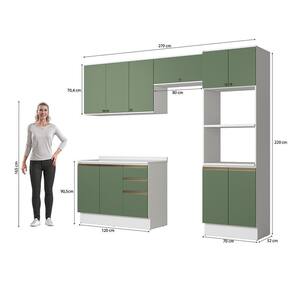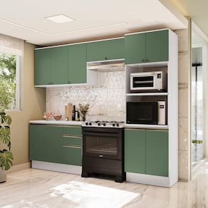 Acabamento: Pintura Brilho / Pintura Fosco | Cor: Branco/Verde Oliva | Corrediças: Telescópicas | Dobradiça: Com Amortecimento / Sem Amortecimento | Garantia: 3 meses para defeito de fabricação | Matéria-prima: MDF / MDP | Peso suportado por cada gaveta: 6 Kg | Peso suportado por cada prateleira: 7 kg | Puxadores: Metálicos / Puxadores de Metal e de Alumínio | Quantidade de gavetas: 3 | Quantidade de portas: 1 / 3 | Quantidade de prateleiras: 1 / 2 / 4 | Sistema de montagem: Parafuso Philips | Tipo de porta: Bater | Duração da garantia: 3 meses | Tipo de garantia: Garantia do fabricante | Montagem: Necessita montagem | Tipo de móveis de cozinha: Combo de móveis de cozinha | Requer montagem: Sim