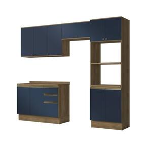 Acabamento: Pintura Fosco / Pintura Touch | Cor: Nogueira/Azul Profundo | Corrediças: Telescópicas | Dobradiça: Com Amortecimento / Sem Amortecimento | Garantia: 3 meses para defeito de fabricação | Matéria-prima: MDF / MDP | Peso suportado por cada gaveta: 6 Kg | Peso suportado por cada prateleira: 7 kg | Puxadores: Metálicos / Puxadores de Metal e de Alumínio | Quantidade de gavetas: 3 | Quantidade de portas: 1 / 3 | Quantidade de prateleiras: 1 / 2 / 4 | Sistema de montagem: Parafuso Philips | Tipo de porta: Bater | Duração da garantia: 3 meses | Tipo de garantia: Garantia do fabricante | Montagem: Necessita montagem | Tipo de móveis de cozinha: Combo de móveis de cozinha | Requer montagem: Sim