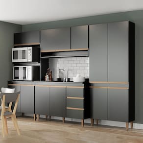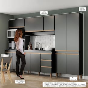 A Cozinha Modulada Sabrina foi desenvolvida para atender todas as suas necessidades do dia a dia com um design moderno, cheio de atitude, personalidade, funcionalidade, beleza e versatilidade. A Cozinha preta é a tendência do momento e foi arquitetada com módulos úteis que vão facilitar a sua rotina diária nos preparos e armazenamento dos utensílios, mantendo sua cozinha sempre organizada. Por se tratar de armários de cozinha modulados você pode ajustar os módulos conforme o espaço disponível e montar diversas modulações diferentes para deixar o ambiente muito mais aconchegante. A elegância fica por conta dos puxadores em perfil e os pés na cor bronze dando um toque único de sofisticação. A Cozinha Sabrina é produzida com materiais de excelente qualidade, garantindo a durabilidade e vida útil. O melhor em móveis no design atual aliando conforto, qualidade e ótimos preços, só na Menu Móveis!