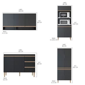 CARACTERÍSTICAS TÉCNICAS: - Produzida em MDP de 15 mm - Acabamento UV na cor Preto Texturizado - Portas com Dobradiça Metálica - Gavetas com Corrediça Telescópica - Puxadores Perfil em ABS na cor Bronze - Pés Regulares em ABS na cor Bronze - Nicho Superior Forno Alt. 40 cm Larg. 77 cm Prof. 50,5 cm - Nicho Inferior Microondas Alt. 35 cm Larg. 77 cm Prof. 50,5 cm - Balcão para Pia de Larg. 120 x Prof. 52 cm, NÃO acompanha TAMPO e PIA