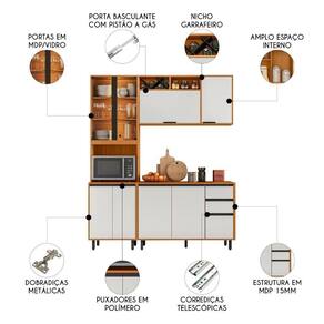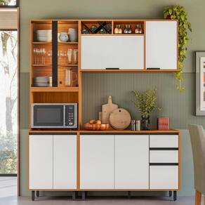 O Armário Aéreo oferece ainda mais praticidade, com duas portas, uma basculante com pistão a gás e outra convencional, além de um nicho decorativo e um nicho adega, ideal para seus rótulos favoritos. Já o Balcão de Cozinha conta com três portas e duas gavetas com corrediças telescópicas, que permitem uma abertura total, facilitando o acesso aos itens armazenados. Com quatro prateleiras internas, o conjunto possui amplo espaço para acomodar seus utensílios e mantimentos de forma prática e eficiente.