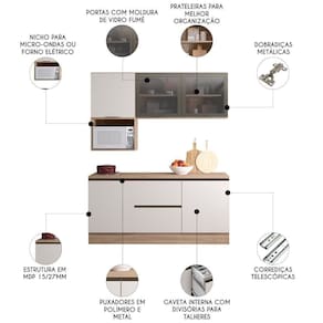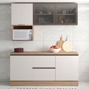 Conteúdo da Embalagem: 1 Armário Aéreo 120cm, 1 Armário Aéreo 58cm, 1 Nicho, 1 Balcão 120cm, 1 Balcão 58cm, 1 Tampo.