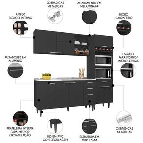 O Paneleiro conta com dois compartimentos para acomodar micro-ondas e forno elétrico, e cinco nichos na parte superior. Ele também inclui três portas, sendo uma delas basculante, além de uma gaveta. O Armário Aéreo vem com duas portas, dois nichos laterais e uma prateleira interna, para auxiliar na organização dos seus utensílios de forma prática e eficiente. Já o Balcão Gabinete dispõe de quatro portas e duas gavetas, com uma prateleira interna que oferece amplo espaço de armazenamento. Todos os móveis possuem estrutura em MDP 15mm, com acabamento em BP, puxadores em alumínio, dobradiças e corrediças metálicas, que garantem máxima resistência no uso diário. A Pia Inox apresenta um design ideal, que tem excelente desempenho no escoamento da água e possibilita o uso de diferentes objetos sobre ela. Os pés em PVC, são reguláveis, permitindo ajustar pequenos desníveis de piso. Este Armário de Cozinha é a solução perfeita para otimizar sua casa, combinando elegância e materiais de alta qualidade.