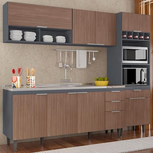 Conteúdo da Embalagem: 1 Armário Aéreo 100cm, 1 Armário Aéreo 80cm, 1 Balcão, 1 Paneleiro, 1 Pia.