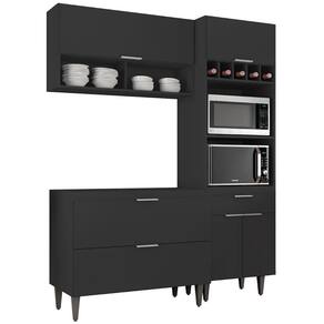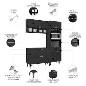 O Paneleiro conta com dois compartimentos para acomodar micro-ondas e forno elétrico, e cinco nichos na parte superior. Ele também inclui três portas, sendo uma delas basculante, além de uma gaveta. O Armário Aéreo vem com uma porta basculante com pistão a gás e dois nichos, para auxiliar na organização dos seus utensílios de forma prática e eficiente. Já o Balcão Para Pia dispõe de duas portas basculantes com fecho trava de , que permite o fechamento com um simples toque. Todos os móveis possuem estrutura em MDP 15mm, com acabamento em BP, puxadores em alumínio, dobradiças e corrediças metálicas, que garantem máxima resistência no uso diário. Os pés em PVC, são reguláveis, permitindo ajustar pequenos desníveis de piso. O balcão não acompanha tampo para que o uso fique opcional com tampo ou pia. Este Armário de Cozinha é a solução ideal para otimizar sua casa, combinando materiais de alta qualidade com um design sofisticado.