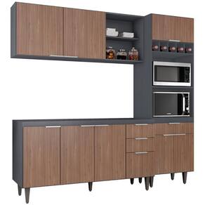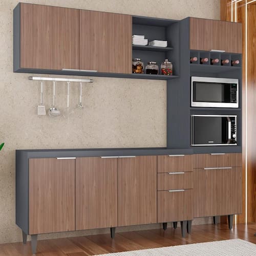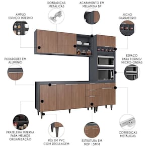 O Paneleiro conta com dois compartimentos para acomodar micro-ondas e forno elétrico, e cinco nichos na parte superior. Ele também inclui três portas, sendo uma delas basculante, além de uma gaveta. O Armário Aéreo vem com duas portas, dois nichos laterais e uma prateleira interna, para auxiliar na organização dos seus utensílios de forma prática e eficiente. Já o Balcão Para Pia dispõe de quatro portas e duas gavetas, com uma prateleira interna que oferece amplo espaço de armazenamento. Todos os móveis possuem estrutura em MDP 15mm, com acabamento em BP, puxadores em alumínio, dobradiças e corrediças metálicas, que garantem máxima resistência no uso diário. Os pés em PVC, são reguláveis, permitindo ajustar pequenos desníveis de piso. O balcão não acompanha tampo para que o uso fique opcional com tampo ou pia. Este Armário de Cozinha é a solução ideal para otimizar sua casa, combinando materiais de alta qualidade com um design sofisticado.