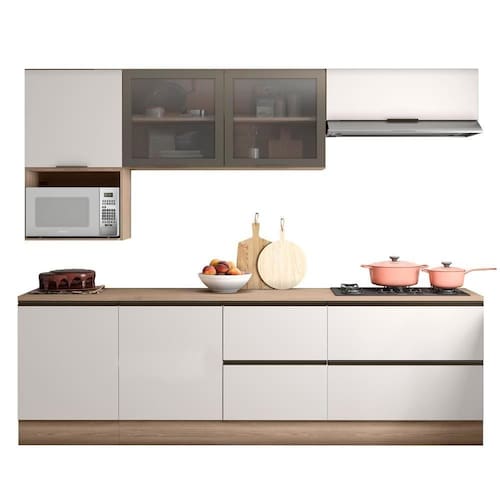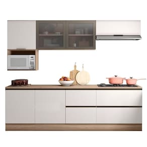 Conteúdo da Embalagem: 1 Armário Aéreo 120cm, 1 Armário Aéreo 80cm, 1 Armário Aéreo 58cm, 1 Nicho, 1 Balcão 120cm, 1 Balcão 80cm, 1 Balcão 58cm, 1 Tampo.