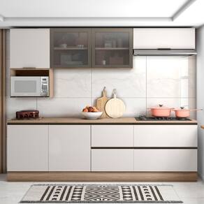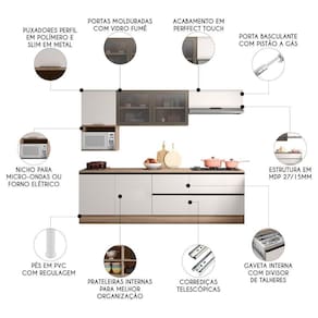 Os Armários Aéreos vem com três portas, sendo duas com moldura e vidro fumê, que agregam um toque de sofisticação. Já o Armário de Geladeira possui uma porta basculante com pistão a gás. Inclui também um nicho ideal para acomodar micro-ondas ou forno elétrico, otimizando o espaço disponível.