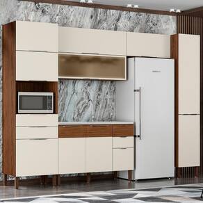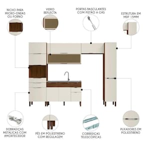 Os Armários Aéreos possuem três portas basculantes, sendo uma delas com vidro reflecta, equipados com dobradiças metálicas e pistão a gás. O Balcão de Cozinha dispõe de três portas, também com dobradiças metálicas e amortecedor, e duas gavetas com corrediças telescópicas, todos com puxadores em poliestireno. Os Paneleiros contam com duas portas basculantes, três portas com dobradiças com amortecedor e duas gavetas, além de nicho para micro-ondas ou forno elétrico. A Pia Inox conta com um design funcional, que tem ótimo desempenho no escoamento da água e possibilita o uso de diferentes objetos sobre ela. O acabamento em pintura fosca texturizada na estrutura e nas gavetas e acetinada nas portas, com secagem realizada por luzes UV, conferem um toque elegante ao Armário de Cozinha. Já os pés, também em poliestireno, são reguláveis, ótimos para ajustar pequenos desníveis de piso e manter a estabilidade do produto.