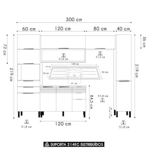 Conteúdo da Embalagem: 1 Armário Aéreo 80cm, 1 Armário Aéreo 120cm, 1 Balcão, 1 Paneleiro Torre Quente, 1 Paneleiro Simples, 1 Pia.