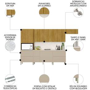 Conteúdo da Embalagem: 1 Armário Aéreo Basculante 80cm, 1 Armário Aéreo 80cm, 1 Armário Aéreo 120cm, 1 Balcão 80cm com tampo, 1 Balcão 120cm, 1 Tampo 120cm, 1 Paneleiro.