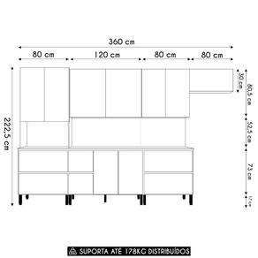 Conteúdo da Embalagem: 1 Armário Aéreo Basculante 80cm, 1 Armário Aéreo 80cm, 1 Armário Aéreo 120cm, 1 Balcão 80cm com tampo, 1 Balcão 120cm, 1 Tampo 120cm, 1 Paneleiro.