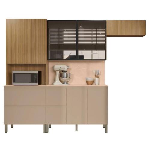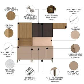 O Armário Aéreo dispõe de duas portas passantes de vidro com bordas em ABS, enquanto o Armário de Geladeira vem com uma porta basculante também com pistão a gás. Já o Balcão de Cozinha possui três portas, uma gaveta externa e uma interna com divisor de talheres, e um Tampo que serve como apoio para eletrodomésticos. Ele também vem com painel, que proporciona um acabamento perfeito entre o balcão e a parede. As dobradiças metálicas com amortecedor e as corrediças telescópicas promovem uma abertura e fechamento suave e sem impactos.