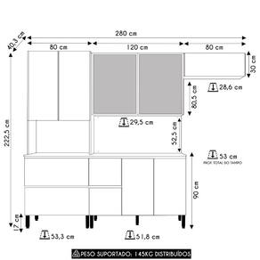 Conteúdo da Embalagem: 1 Paneleiro, 1 Armário Aéreo 120cm, 1 Armário Aéreo 80cm, 1 Balcão, 1 Tampo.