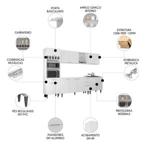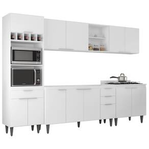 O Paneleiro conta com dois compartimentos para acomodar micro-ondas e forno elétrico, e cinco nichos na parte superior. Ele também inclui três portas, sendo uma delas basculante, além de uma gaveta para melhor organização dos seus utensílios. Os Armários Aéreos dispõe de quatro portas, dois nichos laterais e duas prateleiras internas, agregando praticidade e estilo. Já o Balcão Para Pia e o Balcão 80cm com Tampo possuem seis portas e duas gavetas, com duas prateleiras internas que oferecem amplo espaço de armazenamento. Todos os móveis possuem estrutura em MDP 15mm, com acabamento em BP, puxadores em alumínio, dobradiças e corrediças metálicas, que garantem máxima resistência no uso diário. Os pés em PVC, são reguláveis, permitindo ajustar pequenos desníveis de piso. O balcão gabinete não acompanha tampo para que o uso fique opcional com tampo ou pia. Este Armário de Cozinha é a solução ideal para otimizar sua casa, combinando materiais de alta qualidade com um design sofisticado.
