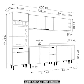 Conteúdo da Embalagem: 1 Armário Aéreo 120cm, 1 Armário Aéreo 80cm, 1 Balcão 118cm, 1 Balcão 80cm, 1 Balcão Porta Pano, 1 Paneleiro, 1 Nicho Adega, 1 Pia.
