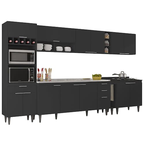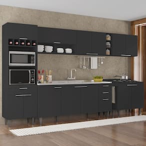O Paneleiro conta com dois compartimentos para acomodar micro-ondas e forno elétrico, e cinco nichos na parte superior. Ele também inclui três portas, sendo uma delas basculante, além de uma gaveta para melhor organização dos seus utensílios. Os Armários Aéreos dispõe de quatro portas convencionais, uma porta basculante com pistão a gás, dois nichos e duas prateleiras internas, agregando praticidade e estilo. O Balcão gabinete e o Balcão 80cm com Tampo possuem seis portas e duas gavetas, com duas prateleiras internas que oferecem amplo espaço de armazenamento. Já o Balcão Porta Pano traz um suporte de aço para guardanapos e o nicho adega que conta com três repartições. Todos os móveis possuem estrutura em MDP 15mm, com acabamento em BP, puxadores em alumínio, dobradiças e corrediças metálicas, que garantem máxima resistência no uso diário. A Pia Inox apresenta um design ideal, que tem excelente desempenho no escoamento da água e possibilita o uso de diferentes objetos sobre ela. Os pés em PVC, são reguláveis, permitindo ajustar pequenos desníveis de piso. Este Armário de Cozinha é a solução perfeita para otimizar sua casa, combinando elegância e materiais de alta qualidade.