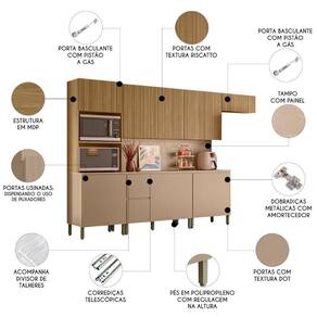 O Paneleiro dispõe de duas portas convencionais e uma porta basculante com pistão a gás. Inclui também dois nichos para micro-ondas e forno elétrico, além de um passa fio adesivo que oculta os cabos, mantendo um visual clean. Os Armários Aéreos são ideais para aproveitar espaços mais altos, com quatro portas convencionais e uma porta basculante, também com pistão a gás.