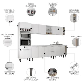 O Paneleiro conta com dois compartimentos para acomodar micro-ondas e forno elétrico, e cinco nichos na parte superior. Ele também inclui três portas, sendo uma delas basculante, além de uma gaveta para melhor organização dos seus utensílios. Os Armários Aéreos dispõe de quatro portas, dois nichos laterais e duas prateleiras internas, agregando praticidade e estilo. O Balcão Para Pia e o Balcão 80cm com Tampo possuem seis portas e duas gavetas, com duas prateleiras internas que oferecem amplo espaço de armazenamento. Já o Balcão Porta Pano traz um suporte de aço para guardanapos e o nicho adega que conta com três repartições. Todos os móveis possuem estrutura em MDP 15mm, com acabamento em BP, puxadores em alumínio, dobradiças e corrediças metálicas, que garantem máxima resistência no uso diário. Os pés em PVC, são reguláveis, permitindo ajustar pequenos desníveis de piso. O balcão gabinete não acompanha tampo para que o uso fique opcional com tampo ou pia. Este Armário de Cozinha é a solução ideal para otimizar sua casa, combinando materiais de alta qualidade com um design sofisticado.