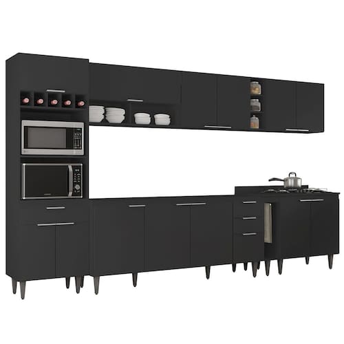 O Paneleiro conta com dois compartimentos para acomodar micro-ondas e forno elétrico, e cinco nichos na parte superior. Ele também inclui três portas, sendo uma delas basculante, além de uma gaveta para melhor organização dos seus utensílios. Os Armários Aéreos dispõe de quatro portas convencionais, uma porta basculante com pistão a gás, dois nichos e duas prateleiras internas, agregando praticidade e estilo. O Balcão Para Pia e o Balcão 80cm com Tampo possuem seis portas e duas gavetas, com duas prateleiras internas que oferecem amplo espaço de armazenamento. Já o Balcão Porta Pano traz um suporte de aço para guardanapos e o nicho adega que conta com três repartições. Todos os móveis possuem estrutura em MDP 15mm, com acabamento em BP, puxadores em alumínio, dobradiças e corrediças metálicas, que garantem máxima resistência no uso diário. Os pés em PVC, são reguláveis, permitindo ajustar pequenos desníveis de piso. O balcão gabinete não acompanha tampo para que o uso fique opcional com tampo ou pia. Este Armário de Cozinha é a solução ideal para otimizar sua casa, combinando materiais de alta qualidade com um design sofisticado.