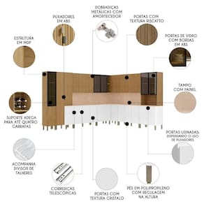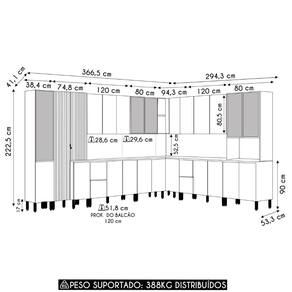 Esta composição dispõe de três Paneleiros que possuem nove portas, incluindo três portas de vidro com bordas em ABS e um Nicho Para Micro-ondas ou forno elétrico. Na parte superior, os Armários Aéreos contam com sete portas, sendo duas de vidro com bordas em ABS, além de dois nichos laterais do Armário de Canto. A bancada é composta por dois Balcões de Cozinha de 120cm e um Balcão de 80cm com oito portas convencionais, duas gavetas externas e duas gavetas internas com dois divisores de talher, e também por um Balcão de Canto com uma porta deslizante. O Tampo serve como apoio para eletrodomésticos e acompanha painel, que é um excelente acabamento entre o balcão e a parede.