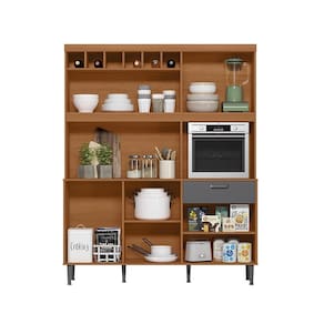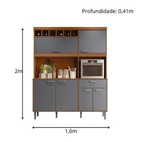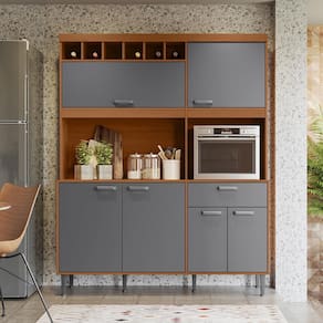 Espaço de Armazenamento InteligenteO Armário Dakota se destaca pelo amplo espaço de armazenamento. Com 5 portas, 1 gaveta, prateleiras e nichos, ele oferece a capacidade necessária para acomodar todos os seus utensílios e louças de forma organizada. Além disso, conta com um espaço especial para adega, perfeito para armazenar até 6 garrafas, e um compartimento para micro-ondas, facilitando o acesso aos eletrodomésticos mais utilizados.