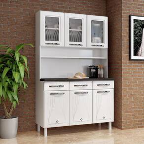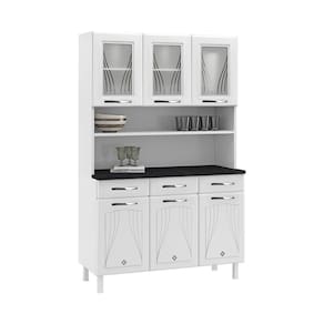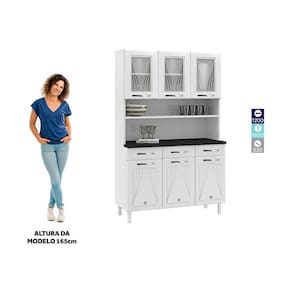 Informações Técnicas: Puxadores: Plástico Tampo: Sim, em MDP Gavetas: 03 Portas: 06 Portas com vidro: 03 Pés: 04 (com regulagem de altura) Cor: Branco brilhante Material: Aço Vidros temperados e serigrafados Portas com design harmônico Puxadores e apliques na cor Ônix Corrediças metálicas