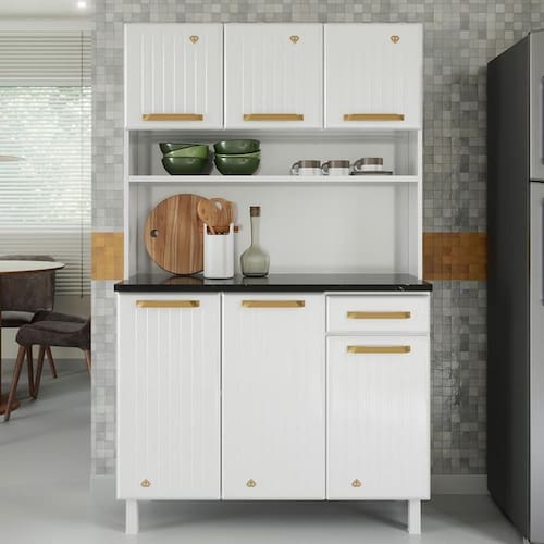 Este Armário Kit Cozinha, da linha Diamante, é uma escolha excelente para ampliar o espaço de armazenamento, organização e decoração na sua casa. Um móvel robusto e durável, fabricado inteiramente em aço, que passa por um processo de pintura eletrostática e anticorrosiva, com acabamento brilhoso um tipo de tratamento recebido que reforça a durabilidade do seu móvel. Composto por 5 portas e um nicho, possui amplo espaço para armazenar seus mantimentos, utensílios, panelas e eletros de maneira bastante organizada. Conta ainda com 1 gaveta equipada com corrediças metálicas que deslizam com facilidade, além da estrutura interna ser polipropileno, um plástico muito rígido, resistente e fácil de lavar. O tampo deste Armário Kit é robusto, desenvolvido em MDP, sendo bastante resistente. Além dessa qualidade já reconhecida, o visual moderno e cheio de personalidade também destaque aqui: as delicadas linhas icais das portas inspiradas na tendência atual da decoração - em combinação com o aplique em alto relevo do diamante e o belo puxador em tom dourado, fazem o ambiente brilhar! A linha Diamante é sinônimo de durabilidade, beleza e praticidade para a sua cozinha!
