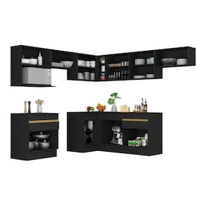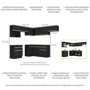 O Armário de Cozinha Completa de Canto com Rodapé Veneza Multimóveis V2106 tem um excelente custo benefício e um amplo espaço interno. Produzido em MDP com acabamento acetinado (cerca de 20% de brilho), que garante maior durabilidade e resistência, possui corrediças metálicas (mais leveza no manuseio), rodapés, que deixam o ambiente mais estiloso, puxadores em ABS e tampo em MDP 15mm com pintura de alta resistência. Os módulos de canto podem ser montados dos dois lados (esquerdo ou direito), conforme a sua preferência. Esta cozinha conta, ainda, com balcão com tampo removível (compatível com pia de 120 cm) com 1 gaveta e 2 portas e balcão para cooktop (o recorte do tampo deve ser realizado na hora da montagem conforme a medida do seu fogão) com 1 gaveta e 1 porta. Os módulos são individuais e você pode montar da maneira que se adaptar melhor ao seu ambiente. Para deixar sua cozinha mais bonita e organizada, possui espaço para microondas, além de compartimento especial para utensílios mais altos.Conteúdo da Embalagem:3 (três) armários aéreos 70cm1 (um) armário aéreo de canto 90cm1 (um) armário aéreo 120cm1 (um) módulo para microondas1 (um) balcão com tampo 70cm1 (um) balcão com tampo de canto 90cm1 (um) balcão com tampo 120cm1 (um) kit com rodapésDimensões do produto montado:Altura: 203cm | Largura: 230 x 242cm | Profundidade: 32cm (aéreos) - 53cm (balcão com tampo)*Você pode consultar as medidas internas na imagem técnica do produto.*As cores do produto podem sofrer variações de tonalidade de acordo com as configurações do seu dispositivo.Imagem meramente ilustrativa. Decoração e eletros não acompanham o produto.O produto será entregue desmontado e não disponibilizamos o serviço de montagem. Acabamento: Pintura Acetinada Texturizada | Cor: Preto/Dourado | Tonalidade: Preto | Material: MDP | Referência do Modelo: V2106 | Coleção: Veneza | Instruções de Cuidado: Limpar com pano seco para retirar o pó. Não utilizar lustra móveis e produtos químicos ou abrasivos à limpeza. | Sistema de Montagem: O produto acompanha manual de montagem e kit ferragem. O produto será entregue desmontado e não disponibilizamos o serviço de montagem. | Produto Composto por: 3 armários aéreos 70cm, 1 armário aéreo de canto 90cm, 1 armário aéreo 120cm, 1 módulo para microondas, 1 balcão com tampo 70cm, 1 balcão com tampo de canto 90cm, 1 balcão com tampo 120cm, 1 kit com rodapés, manual de montagem e kit ferragem. | Altura Montado: 203 | Largura Montado: 230 | Profundidade Montado: 242 | Tamanho (L x A x P): 230 x 203 x 242 | Peso do Produto: 156 | Garantia do Fabricante: 3 | Fabricante: Multimóveis | Requer Montagem: Sim | Quantidade de Portas: 10 | Quantidade de Gavetas: 2 | Quantidade de Prateleiras: 6 | Quantidade de Puxadores: 12 | Quantidade de Pés: 13 | Porta com Vidro: Não | Corrediça: Metálica | Material do Puxador: ABS | Material dos Pés: Polipropileno | Acompanha Pia Inox: Não | Balcão 120 cm compatível para uso de pia: Sim | Tampo Incluso: Sim | Quantidade de Tampos: 3 | Material do Tampo: MDP | Espessura do Tampo: 1.5 | Com Prateleiras: Sim | Produto: Cozinha Completa | Tipo: Modular | Altura (cm): 203 cm | Largura (cm): 230 cm | Profundidade (cm): 242 cm | Estado de Origem: RS | Produto precisa de Montagem?: Sim, sugerimos a contratação do nosso serviço de montagem (para os CEPs em que o serviço está disponível) ou de algum profissional experiente de sua preferência | Ubicação do móvel: Não aplica | Altura do Produto com Embalagem: 112 | Largura do Produto com Embalagem: 65 | Comprimento do Produto com Embalagem: 125 | Peso do Produto com Embalagem: 156 | Nome do Produto no Fornecedor: Armário de Cozinha Completa de Canto com Rodapé Veneza Multimóveis V2106 Preto/Dourado | Descrição do Tamanho: (L x A X P): 230 x 203 x 242 cm | Tempo de Garantia: 3 meses | Destaque 1: MDP com acabamento acetinado: maior durabilidade e resistência. | Destaque 2: Balcão com tampo removível: pode ser utilizado com pia. | Destaque 3: Gavetas com corrediças metálicas: mais leveza no manuseio. | Destaque 4: Tamanho do Produto Montado (L x A X P): 230 x 203 x 242 cm | Destaque 5: Os módulos são individuais e você pode montar da maneira que se adaptar melhor ao seu ambiente. Garantia de 90 dias contra defeitos de fabricação. | Marca: Multimóveis | Acessórios incluídos: N/A Cor: Preto/Dourado