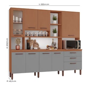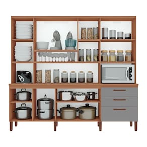 Apresentamos o Armário de Cozinha Diana! Este armário apresenta um design inovador, combinando estilo e praticidade. Destaca-se pela torre quente, que é um cantinho reservado para micro-ondas, facilitando também o acesso aos utensílios mais utilizados. Sua excelente divisão interna proporciona organização eficiente do espaço. O acabamento de alta qualidade, com pintura touch e pés com regulagem, adiciona sofisticação e adequação a qualquer ambiente. Equipada com corrediças telescópicas, as gavetas deslizam suavemente, otimizando a arrumação dos utensílios.