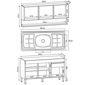 Armário Aéreo: 150 x 67 x 28,6 cm.