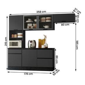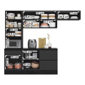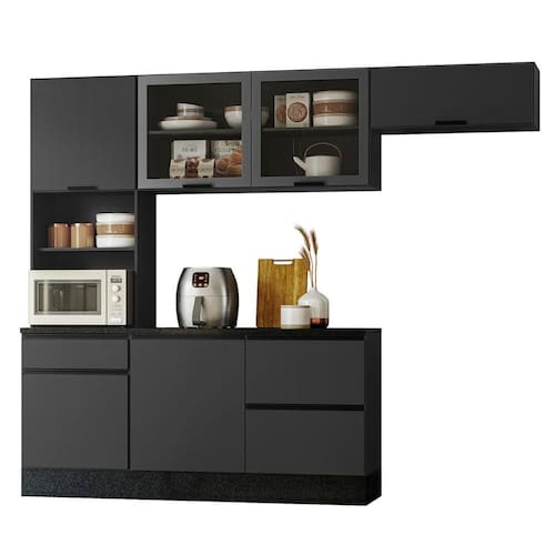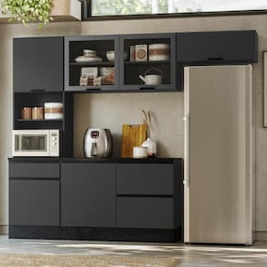 Produzida em MDP de alta qualidade, conta com 6 portas (incluindo uma basculante com pistão a gás) e 4 gavetas com corrediças telescópicas, garantindo praticidade no dia a dia.
