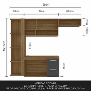Medidas da Cozinha Montada: A:150,5cm | L:190cm | Profundidade do Balcão:35,3cm | Profundidade da Cozinha: 25,5cm