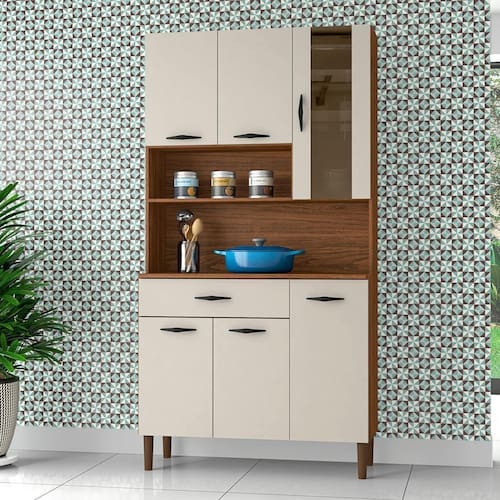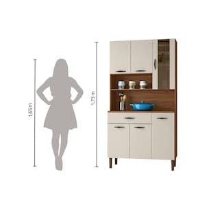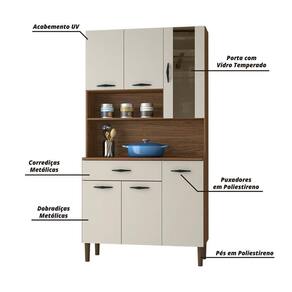 Armário De Cozinha Completa Golden Nogueira / Off White Descrição: O Armário Golden é produzido em MDP com portas e gaveta em 15 mm, matéria prima que respeita o meio ambiente. São seis portas, sendo uma porta superior com vidro temperado serigrafado e uma ampla gaveta. Nas portas e gaveta são utilizadas corrediças e dob | MODELO: Armário de Cozinha Golden | MARCA: Kit's Paraná | COR: Nogueira/ Off White | Medidas: [ A ] = 173,5 cm [ L ] = 90,9 cm [ P ] = 36,3 cm | MATERIAL: MDP 15mm | ACABAMENTO: UV | PORTAS: 6 portas (Sendo 1 porta superior com vidro Temperado) | GAVETA: 1 gaveta | PUXADORES: Poliestireno | CORREDIÇAS: Metálicas | DOBRADIÇAS: Metálicas | PÉS: Fixos em plástico resistente (polipropileno) | PESO: 33,9kg | SUPORTA: 45kg | GAVETAS SUPORTAM: 4kg | SITEMA DE MONTAGEM: Pregos parafusos e cavilhas | AVISO: Montagem não inclusa. Entregamos até a porta de entrada da casa do cliente ou até a portaria do condomínio. Cor: Nogueira / Off White