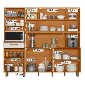 Com estrutura resistente em MDP, 11 portas e 1 gaveta com corrediças telescópicas, ele oferece amplo espaço para guardar utensílios e mantimentos.
