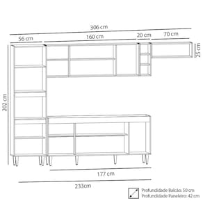 Conteúdo da Embalagem: 1 Balcão 180cm, 1 Armário Aéreo 160cm, 1 Nicho Riad, 1 Armários Aéreos 70cm, 1 Paneleiro.