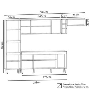 Conteúdo da Embalagem: 1 Balcão 180cm, 1 Armário Aéreo 160cm, 1 Nicho Riad, 1 Armários Aéreos 70cm, 1 Paneleiro.