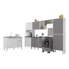 O conjunto conta com espaços dedicados para colocação de micro-ondas (até 9kg), utensílios mais altos e fogão ou geladeira. Os puxadores em ABS com acabamento cromado e os pés em polipropileno com regulagem de altura proporcionam estilo e um perfeito nivelamento aos módulos. O balcão de maior profundidade possui tampo removível e é com pia de 105cm, trazendo praticidade nas rotinas na cozinha. Pia NÃO inclusa. As portas são embutidas no móvel, oferecendo um visual de cozinha planejada.