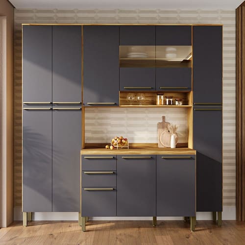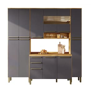Armário de Cozinha Modulada com Balcão e Tampo 12 Portas 2 Gavetas Xangai 100% Mdf com Vidro Reflecta Amêndoa/Cinza - Pnr Móveis