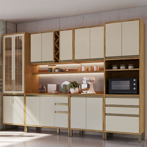 O(a) Armário de Cozinha Modulada com Balcão e Tampo 16 Portas 5 Gavetas Pérola Plus com Prateleiras 100% Mdf Vidro Reflecta Amêndoa/Off White - Pnr Móveis é produzido em 100% MDF na escala de brilho Semi-Brilho, e possui um grau de dificuldade de montagem: Médio.