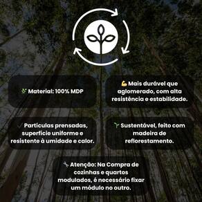 Características: Produzida em MDP de 15 mm Acabamento UV Portas com Dobradiça Metálica Porta Basculante com Pistão a Gás Gavetas com Corrediça Telescópica Puxadores Perfil em ABS Pés com Regulagem em ABS NÃO acompanha TAMPO e PIA