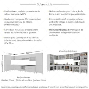 - Espaços internos amplos e bem distribuídos para organização de utensílios de cozinha e mantimentos.