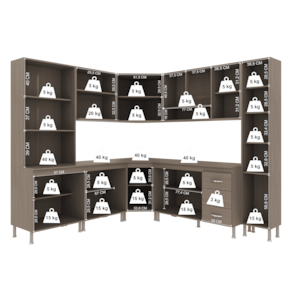 Profundidade: 53cm (balcões) | 32cm (aéreos)